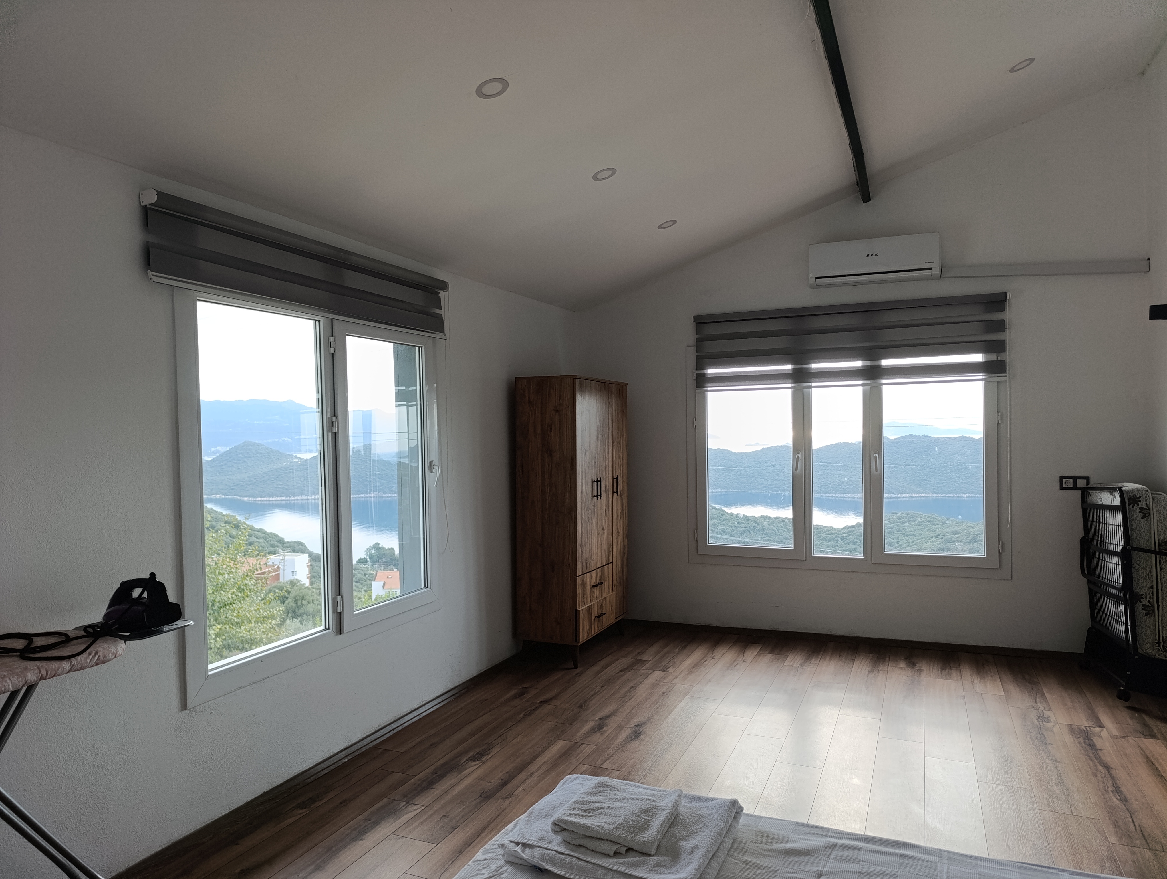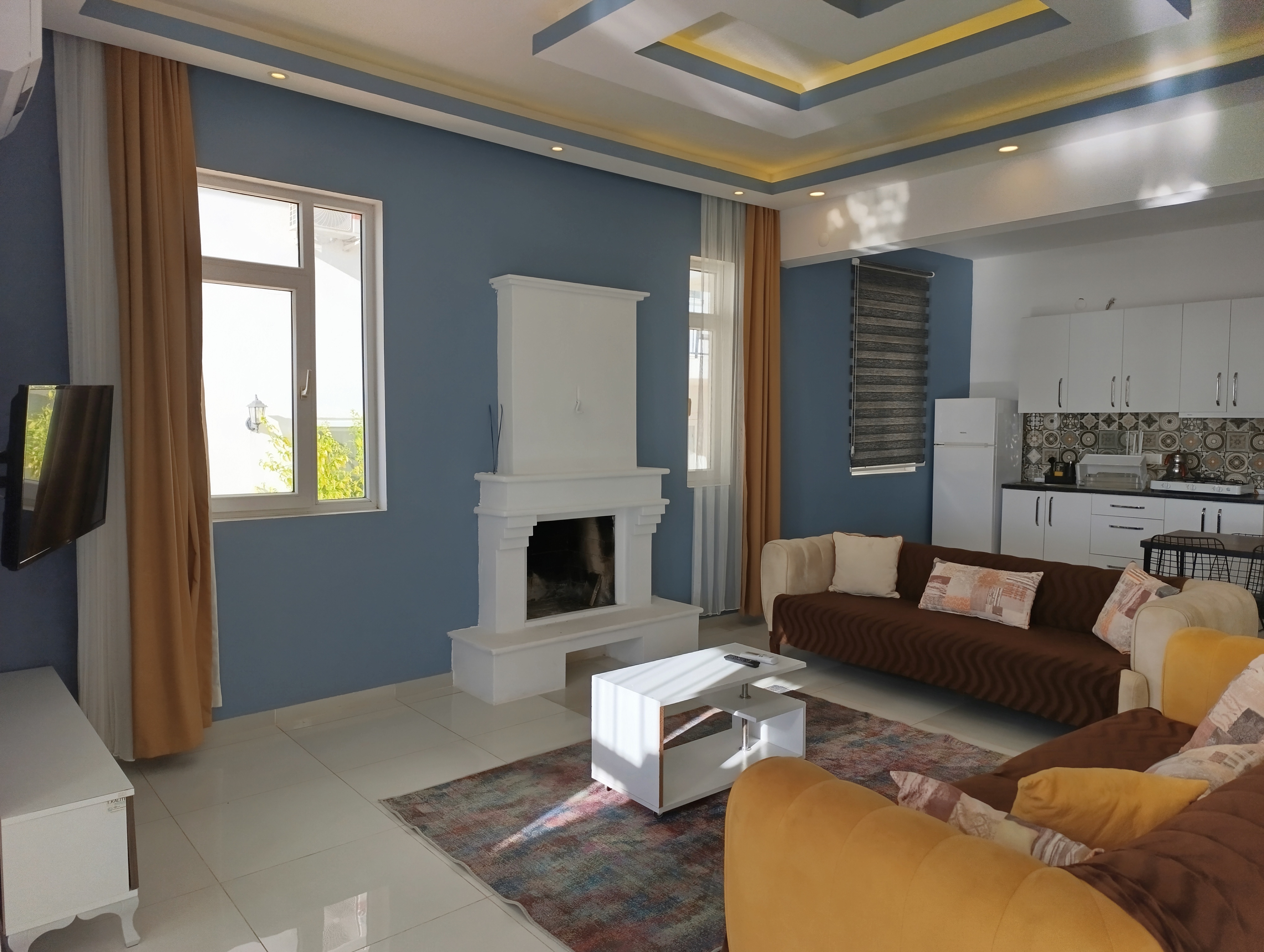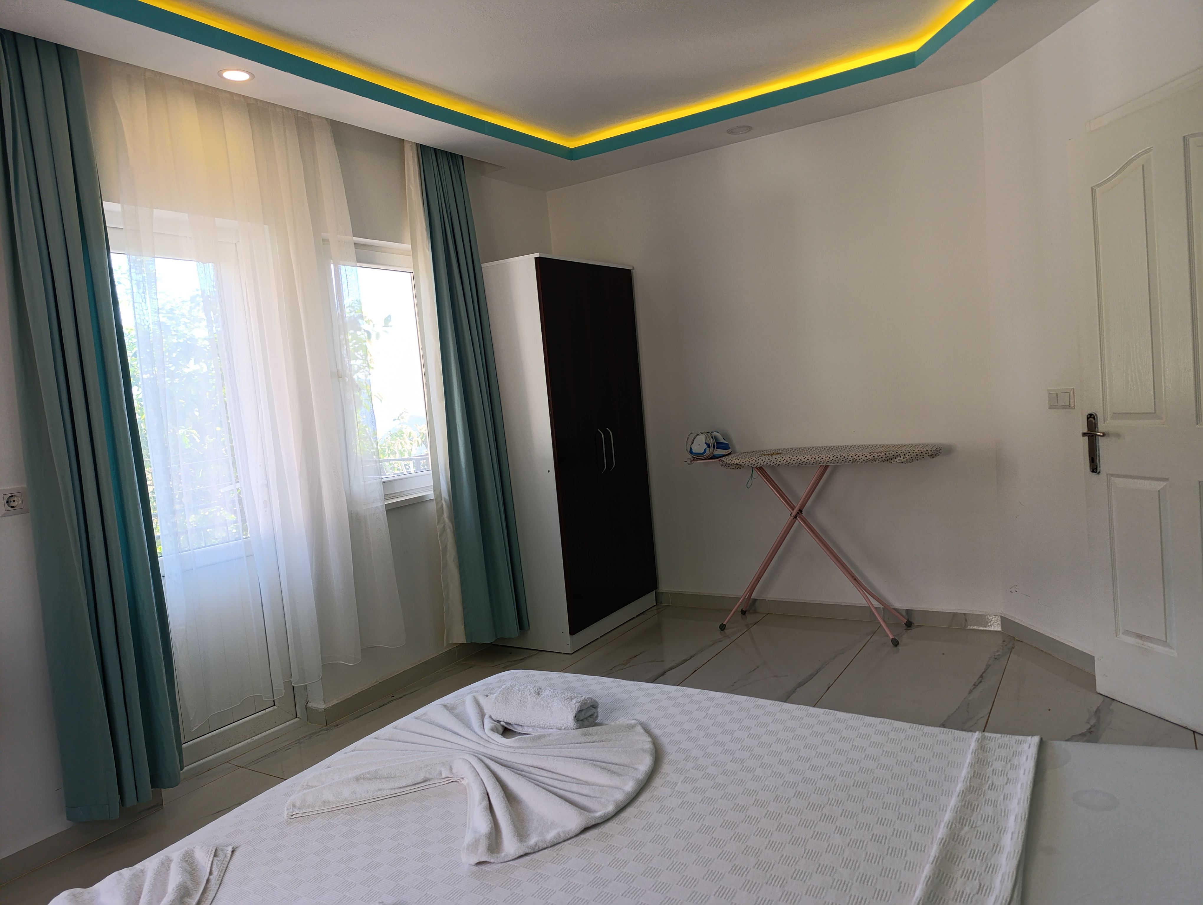 2+1 apart with seaview balcony 1. bedroom queen size bed 2. bedroom three single bed living area has fireplace, two sofa, kitchen, washing mac.