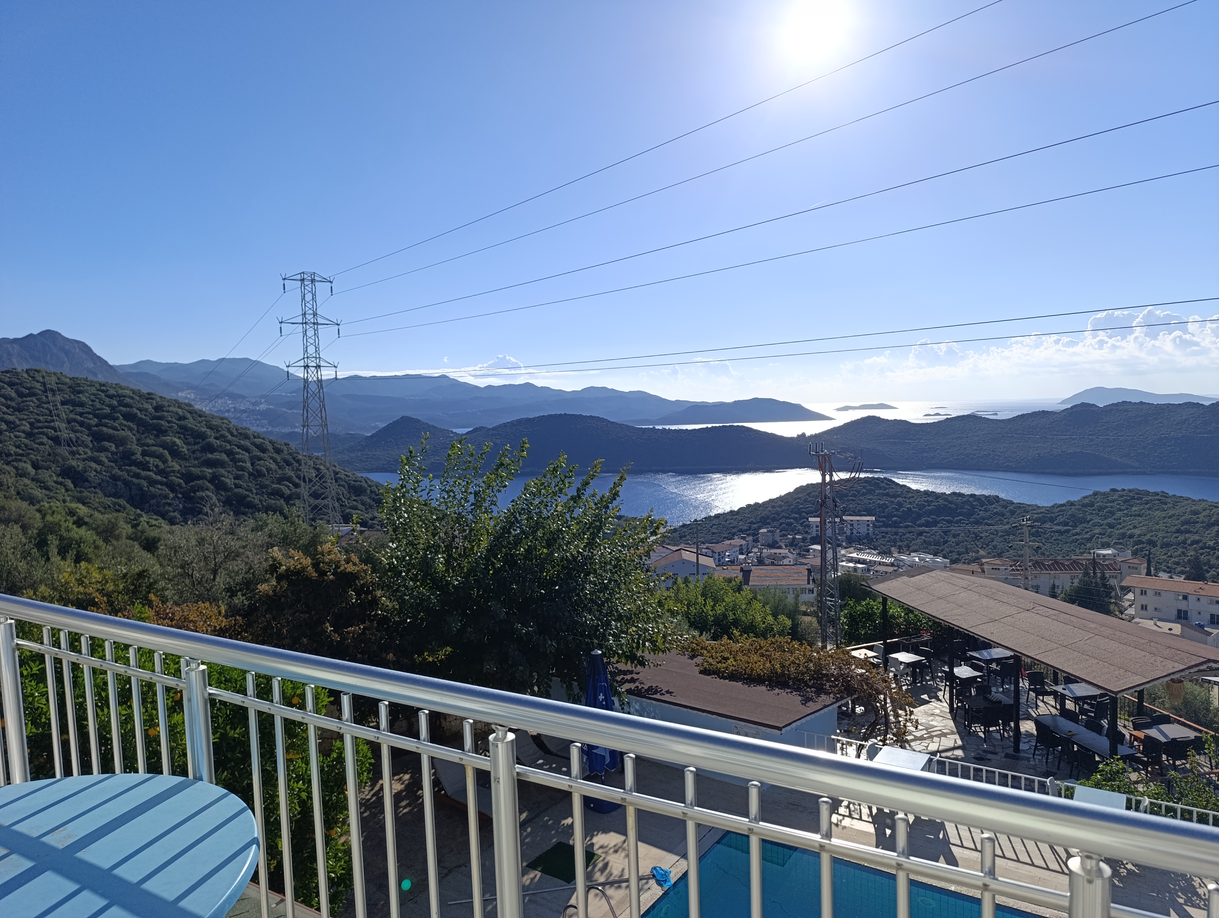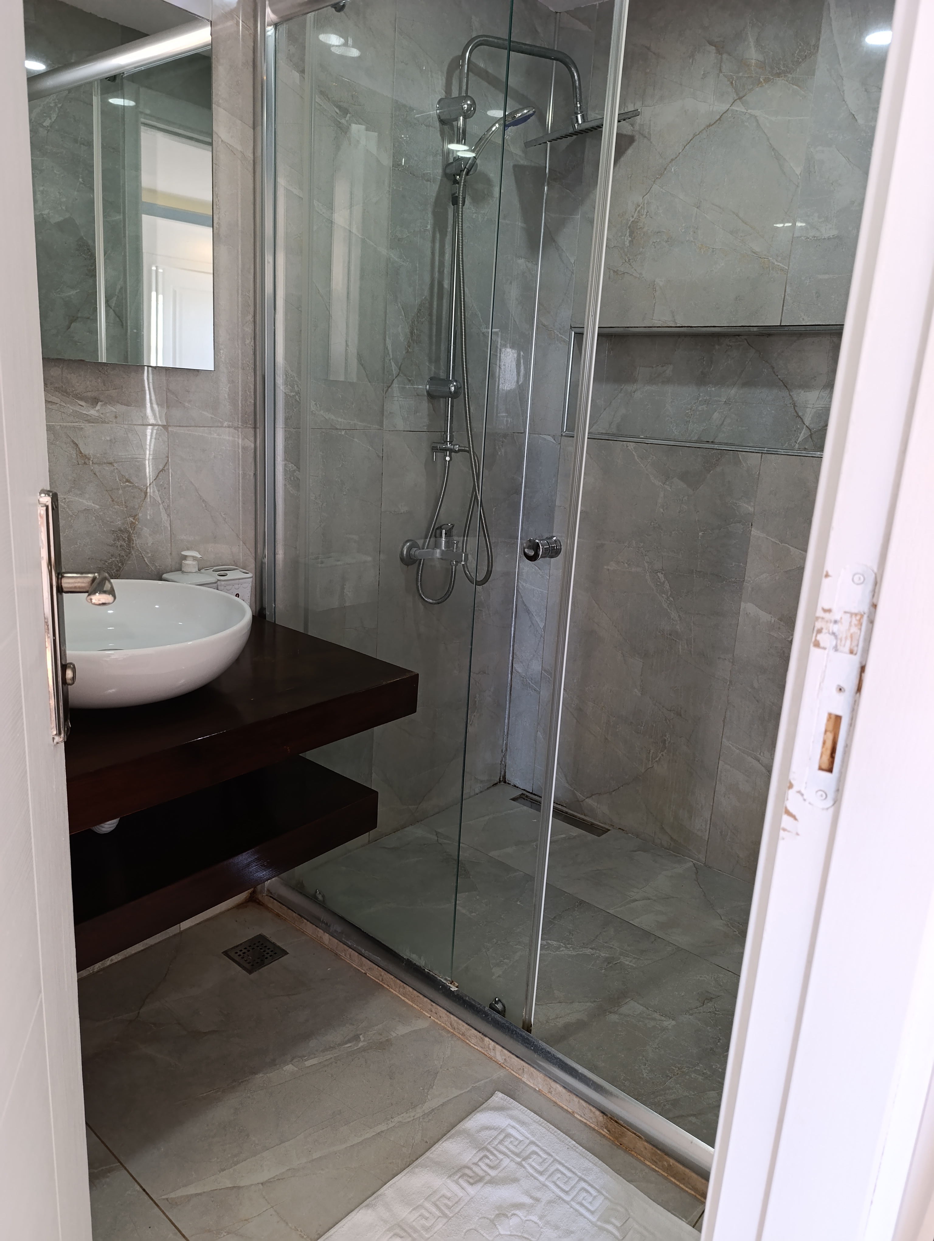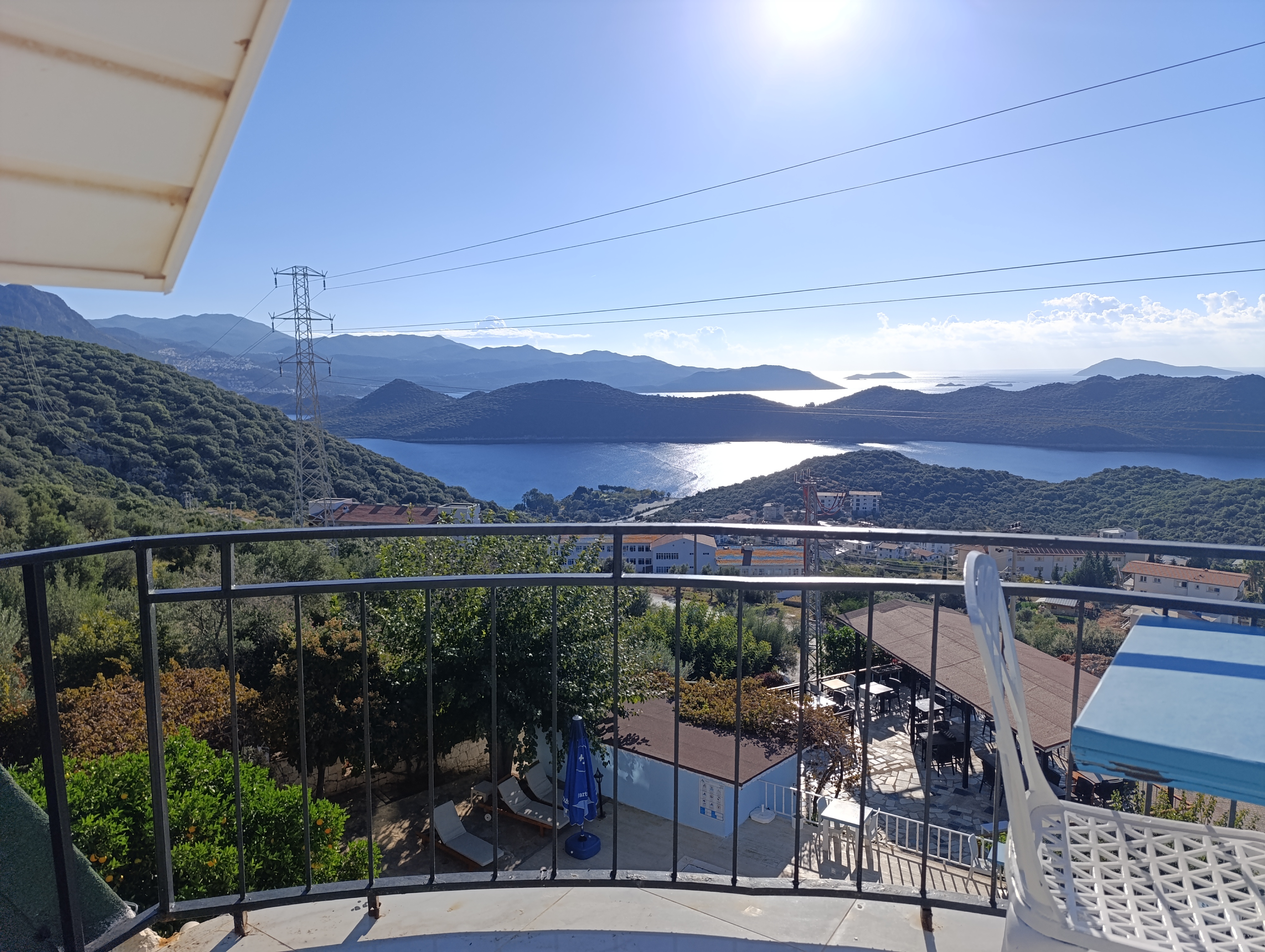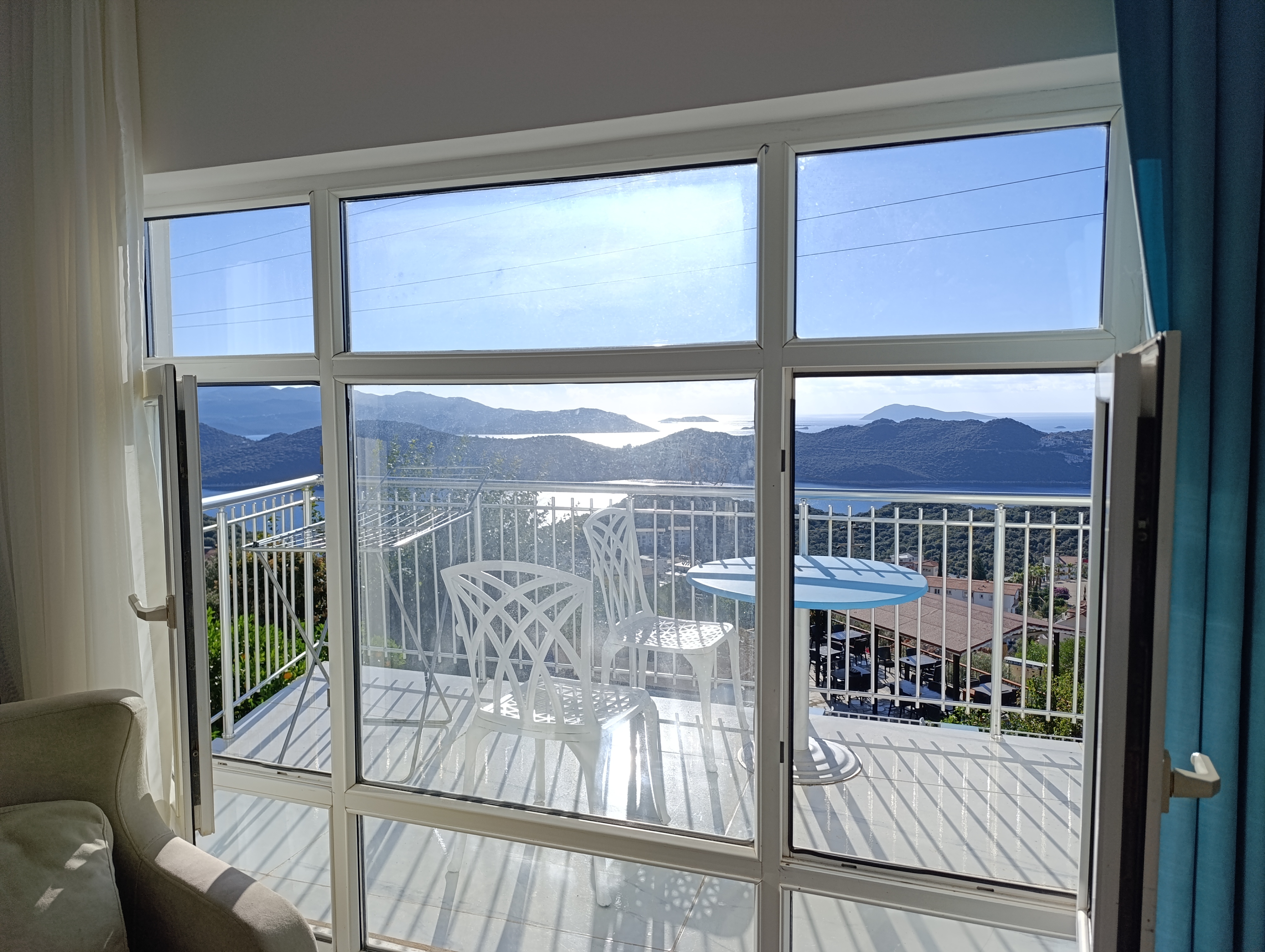 2+1 apart with seaview balcony 1. bedroom queen size bed 2. bedroom three single bed living area has fireplace, two sofa, kitchen, washing mac.