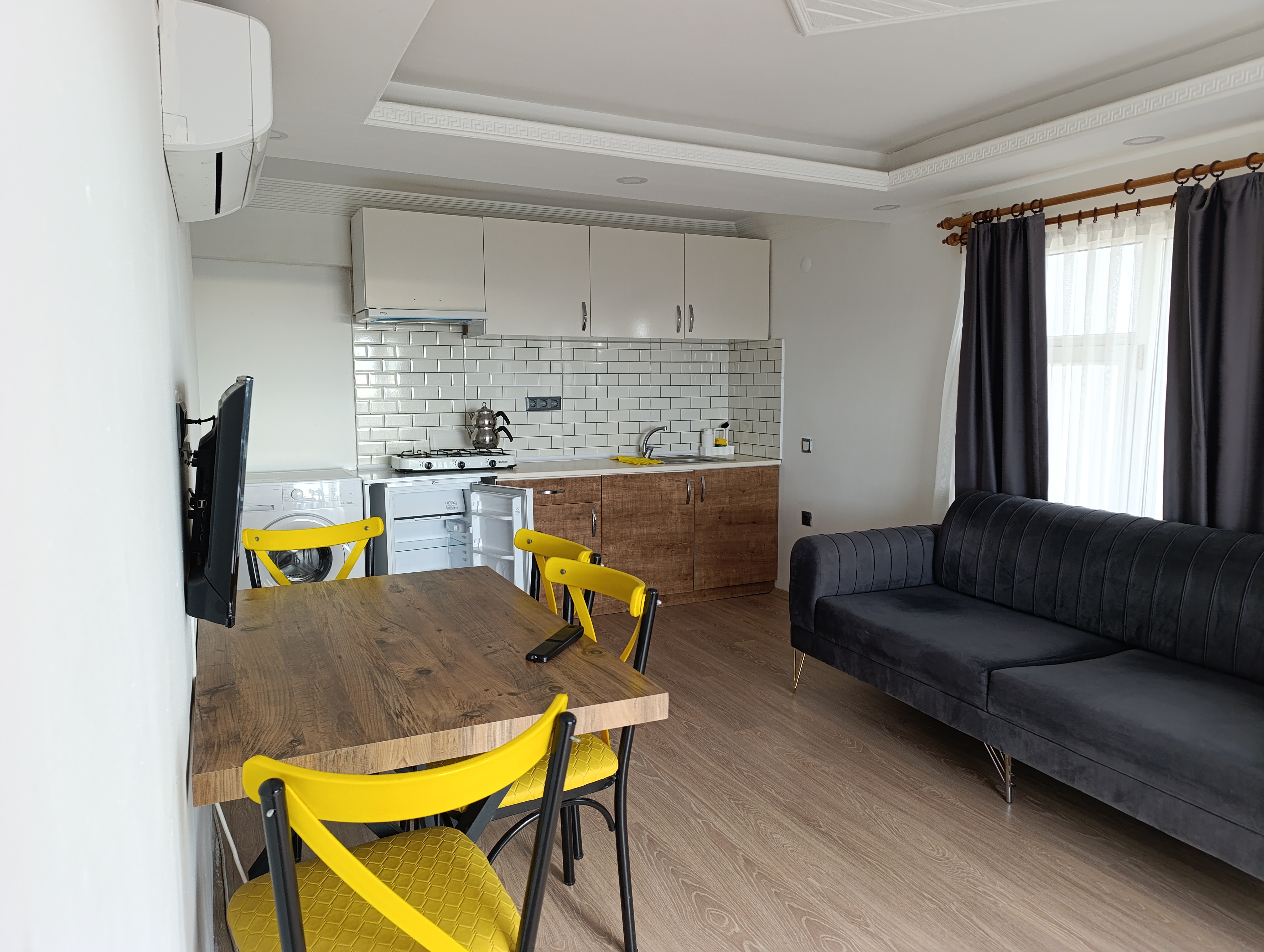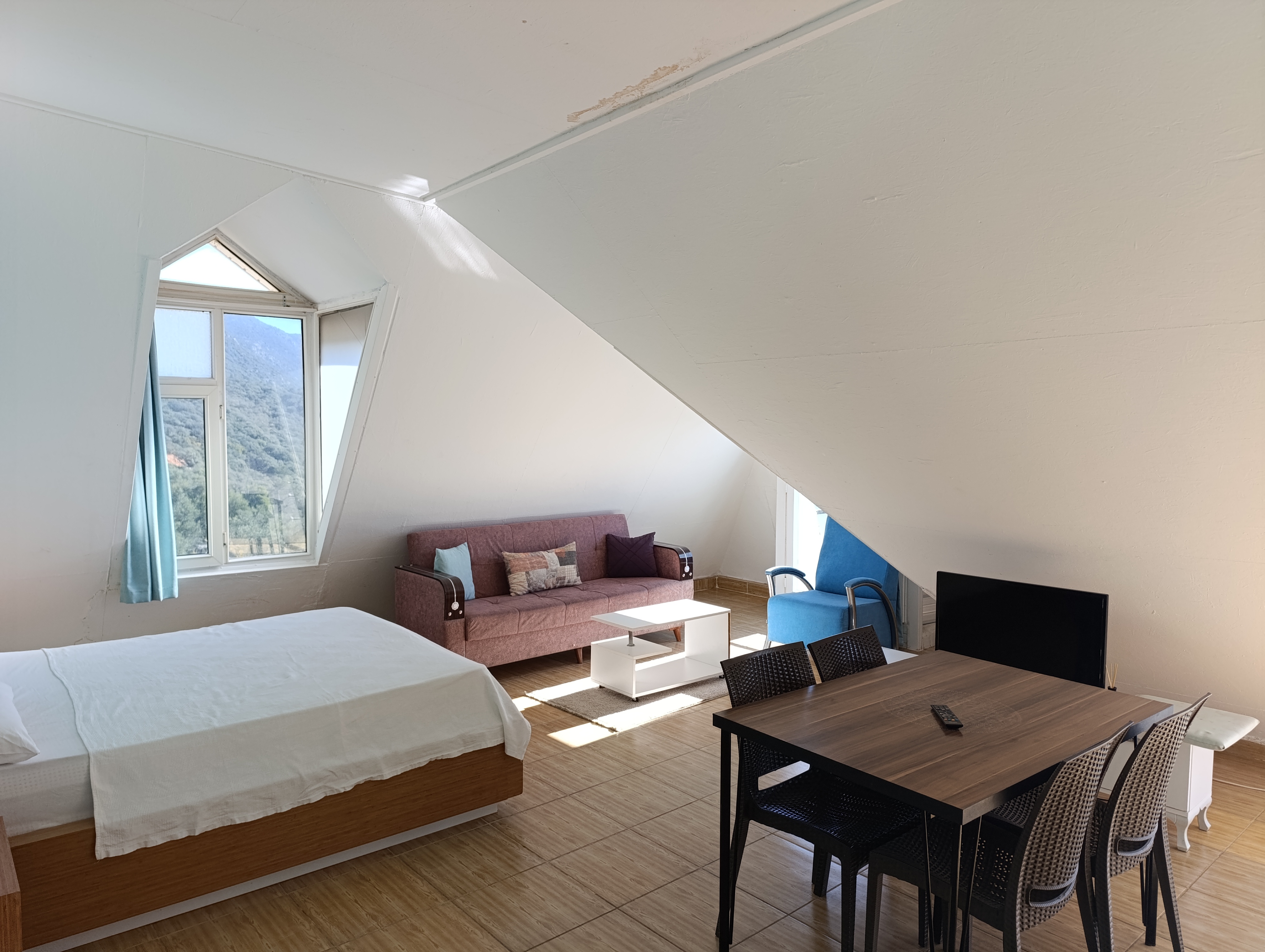Dairemiz 1+1 daire şeklinde olup yatak odasında 1 adet çift kişilik yatak, salonda oturma grubu, mutfak ve mutfak gereçleri, doğa manzaralı bir balkon, WC & DUŞA sahiptir. Our apartment is in the form of a 1 + 1 flat and has 1 double bed in the bedroom, sitting group in the living room, kitchen and kitchen utensils, a balcony with nature view, WC & SHOWER.